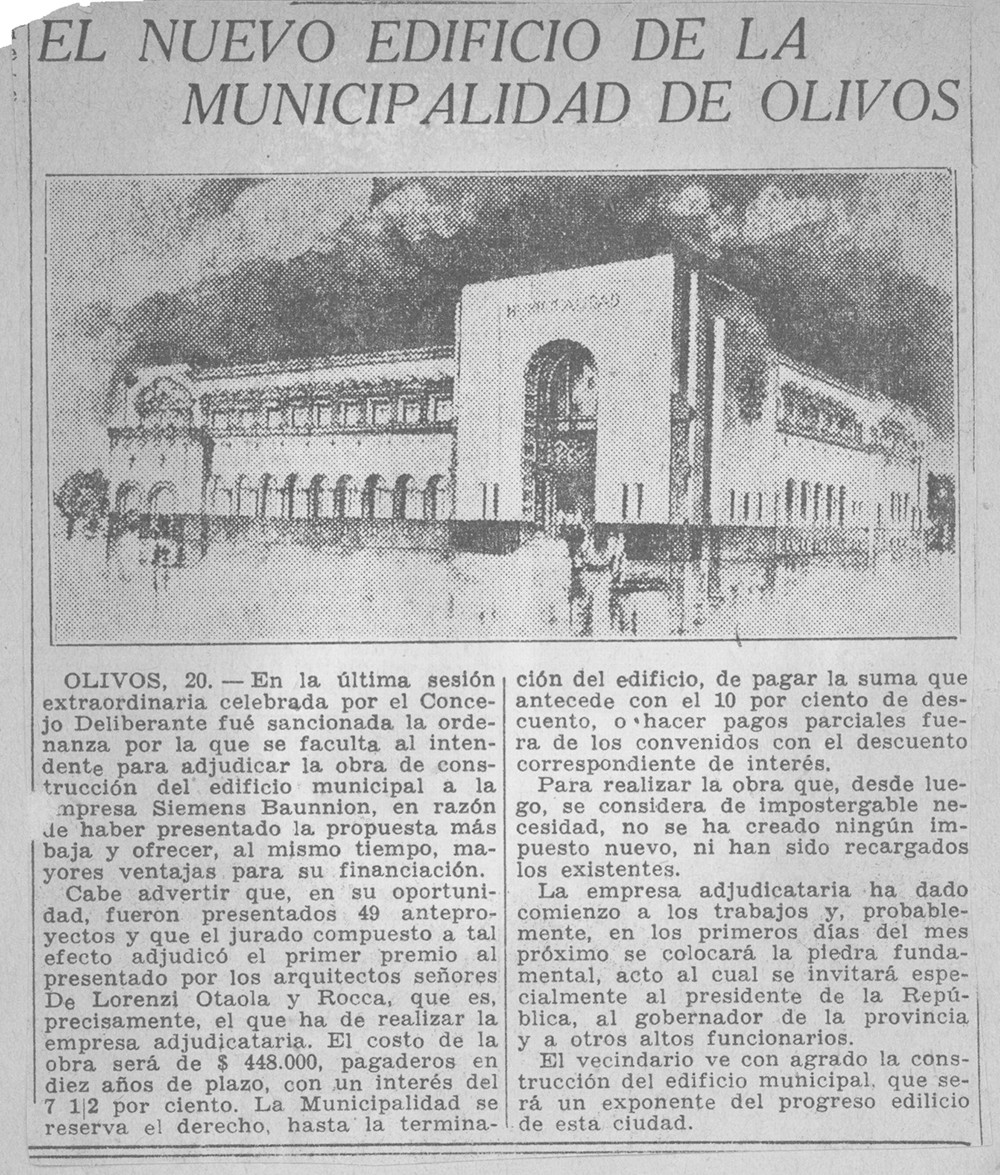Nota periodística del diario La Nación, con fecha del 21 de abril de 1935, que hace referencia a una sesión extraordinaria celebrada por el Concejo Deliberante. En dicha sesión, se sancionó la ordenanza que facultaba al Intendente para adjudicar la obra de construcción del nuevo edificio municipal a la empresa Siemens Baunnion.