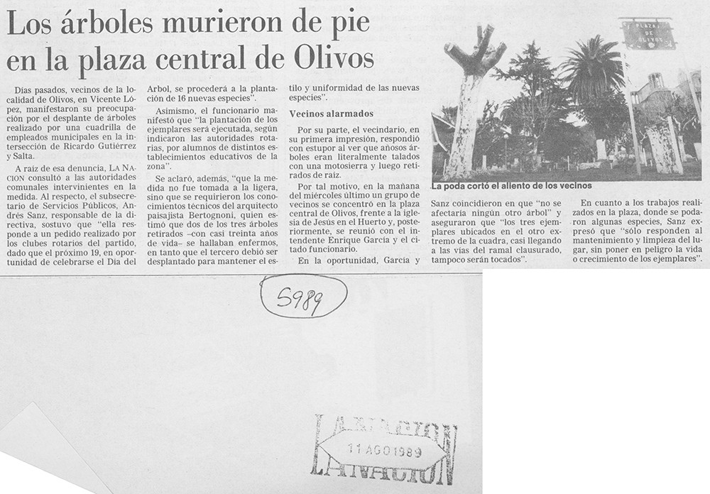 El 11 de agosto de 1989, el Diario La Nación informó sobre la preocupación de los vecinos de Olivos por el desplante de árboles en la intersección de Ricardo Gutiérrez y Salta, realizado por empleados municipales. La inquietud vecinal llevó a que las autoridades comunales fueran consultadas sobre la medida tomada.