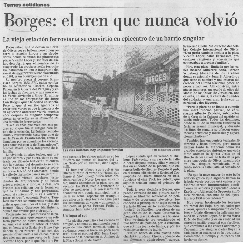 Nota periodística del diario La Nación con fecha del 16 de mayo de 1987, que hace referencia a la estación Borges, sus vecinos y las actividades que en su momento ocurrían en los alrededores de la estación.