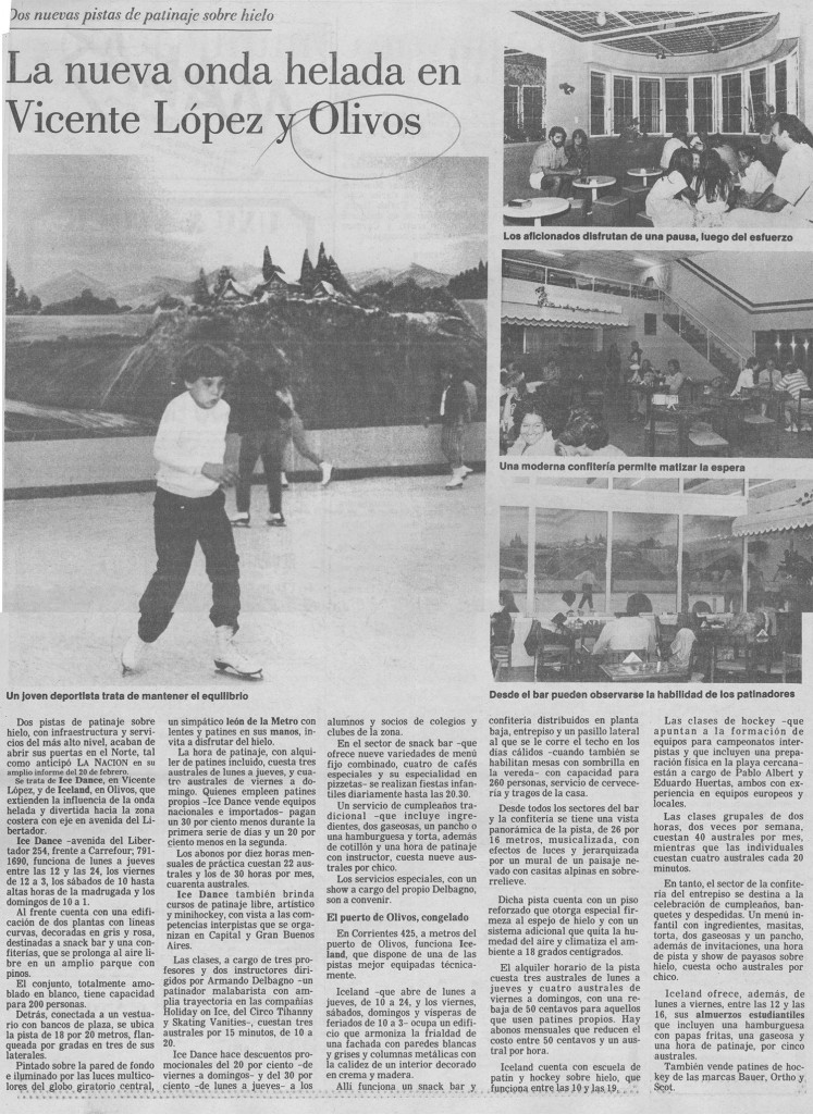 Nota periodística del diario La Nación con fecha del 10 de abril de 1987, que hace referencia a las dos pistas de patinaje sobre hielo existentes en el Partido de Vicente López.