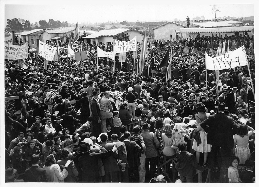 En la imagen se observa al público frente al palco, en el que se encontraban, la señora María Eva Duarte de Perón; Dr. Héctor J. Cámpora, presidente de la Cámara de Diputados y el Sr. Carlos M. Seeber, Diputado Nacional por la Provincia de Buenos Aires.