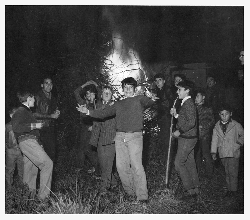 La fotografía muestra a un grupo de niños y adolescentes celebrando la Fogata de San Pedro en Vicente López en 1964. En el centro de la imagen, los jóvenes se agrupan frente a una gran hoguera, símbolo de la festividad que se realiza alrededor del 29 de junio. Esta celebración coincide con la festividad de San Pedro y San Pablo en el calendario católico y marca el solsticio de invierno en el hemisferio sur. La fogata simboliza la purificación, el renacimiento y la protección contra los males, evocando un fuerte sentido de comunidad y alegría colectiva.