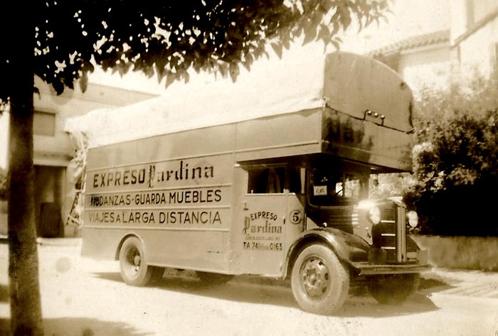 Un camión anaranjado de mudanzas de la empresa Expreso Pardina estacionado frente a la oficina y guardamuebles de la misma compañía, ubicada en la barranquita de Juan B. Justo 1585.