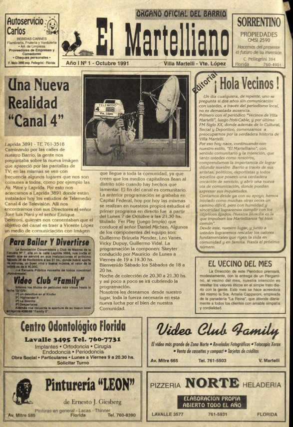 Primer ejemplar del periódico El Martelliano, fundado por Hugo Pane, periodista y vecino de Villa Martelli, el 17 de octubre de 1991. La portada se define como órgano oficial del barrio de Villa Martelli. Este medio vecinal fue creado con la intención de dar visibilidad a la comunidad local y destacar su identidad barrial.