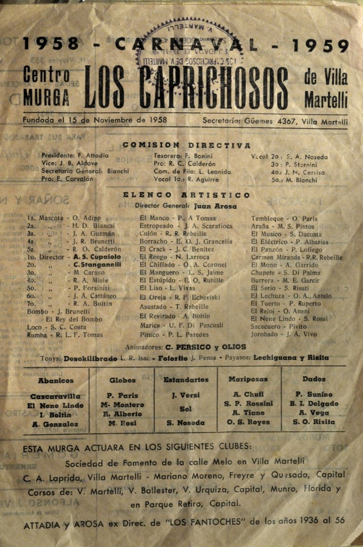 Murga Los Caprichosos, fundada el 15 de noviembre de 1958, en los carnavales de los años 1958-1959.