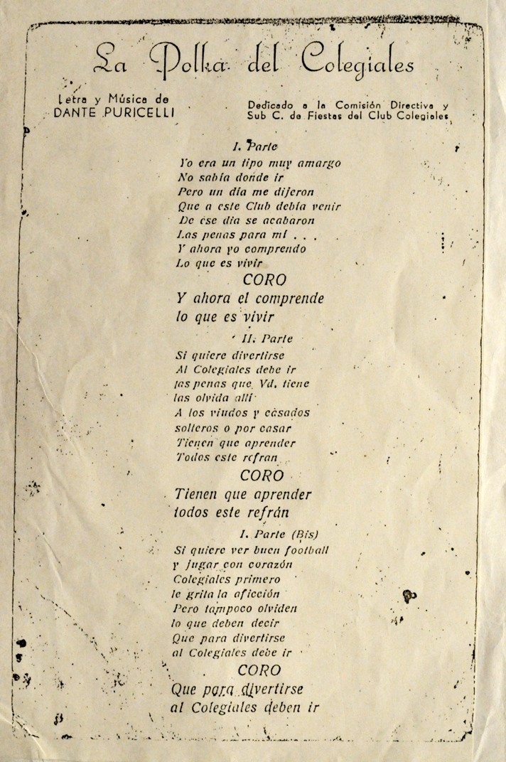 Canción La Polka del Colegiales, con letra y música de Dante Puricelli reconocido cantautor de tangos y milongas. Dedicada a la subcomisión de fiestas del Club Atlético Colegiales.