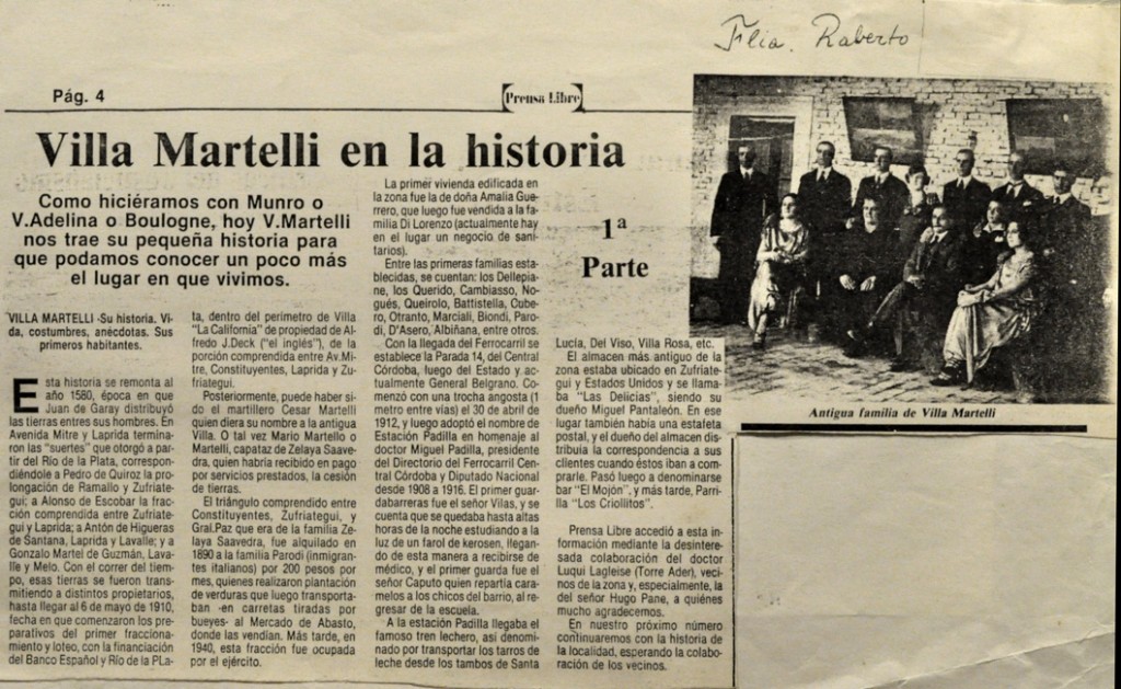 Nota publicada en Prensa libre, sobre la historia de Villa Martelli, en la que hace mención de las familias pioneras tales como Dellepiane, Queirolo, Battistella, Cubero, Otranto, Marciali, Biondi, Parodi, D´Asero y Albiñana, entre otras.