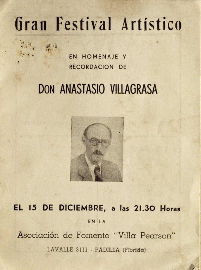 Programa del festival artístico en homenaje a Anastasio Villagrasa, realizado en la Asociación de Fomento Villa Pearson, ubicada en General Juan Lavalle 3111, Villa Martelli. En la actualidad, este edificio alberga el Jardín Maternal Municipal N.º 6.