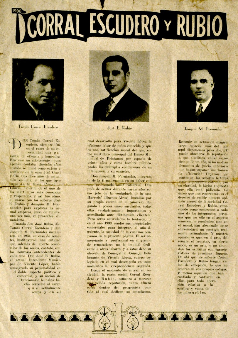 Reseña biográfica de la Sociedad Corral Escudero y Rubio, formada por los Señores José Rubio, Joaquín Fernández y Tomás Corral Escudero.