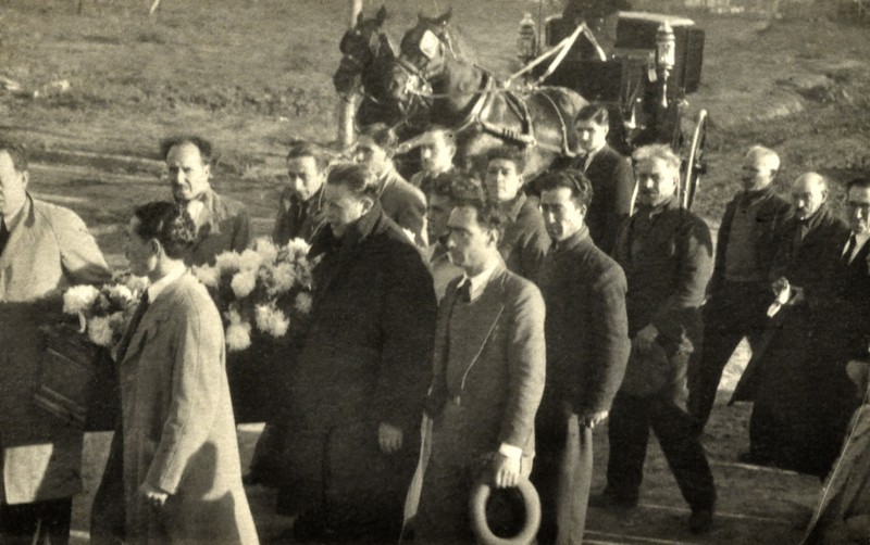 En la imagen, varios hombres llevan el ataúd de Pedro Borretini, seguidos por una carroza fúnebre tirada por caballos. Esta escena refleja una tradición solemne de la época, destacando el respeto y la ceremonia asociados a los rituales de despedida.