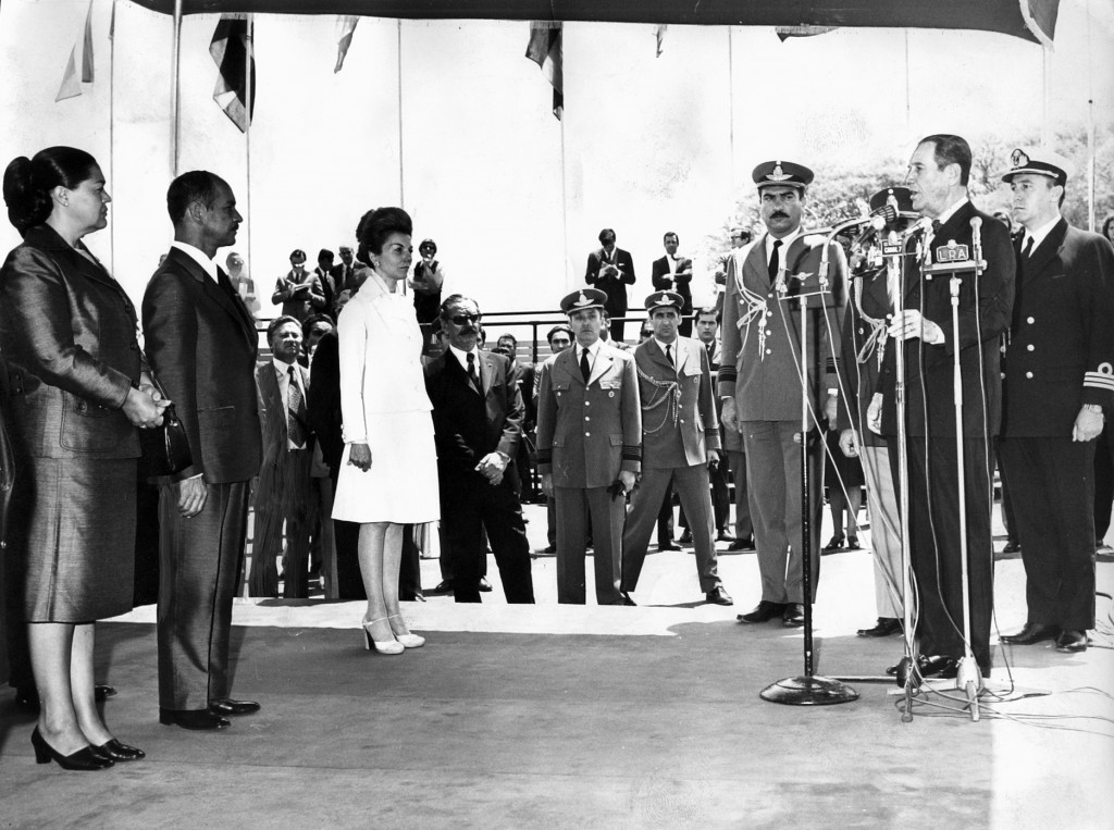 Ubicadas las autoridades en el estrado levantado especialmente, el presidente de la Nación, teniente general Juan Perón pronuncia palabras de bienvenida al mandatario boliviano, general Banzer. Aparecen también en la fotografía la vicepresidenta de la Nación, señora María Estela Martínez de Perón y la esposa del presidente visitante señora Yolanda Prada de Banzer.