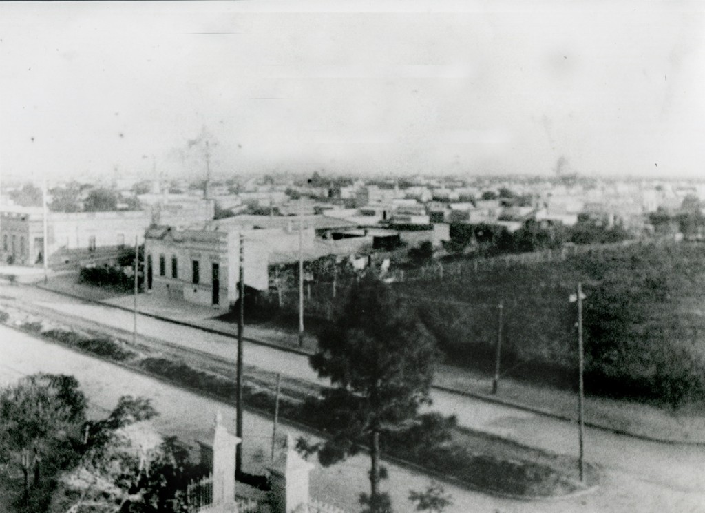 La fotografía fue tomada desde la residencia de Flora Pelliza, capturando la zona de Avenida Maipú y la actual calle Juan Bautista Alberdi.