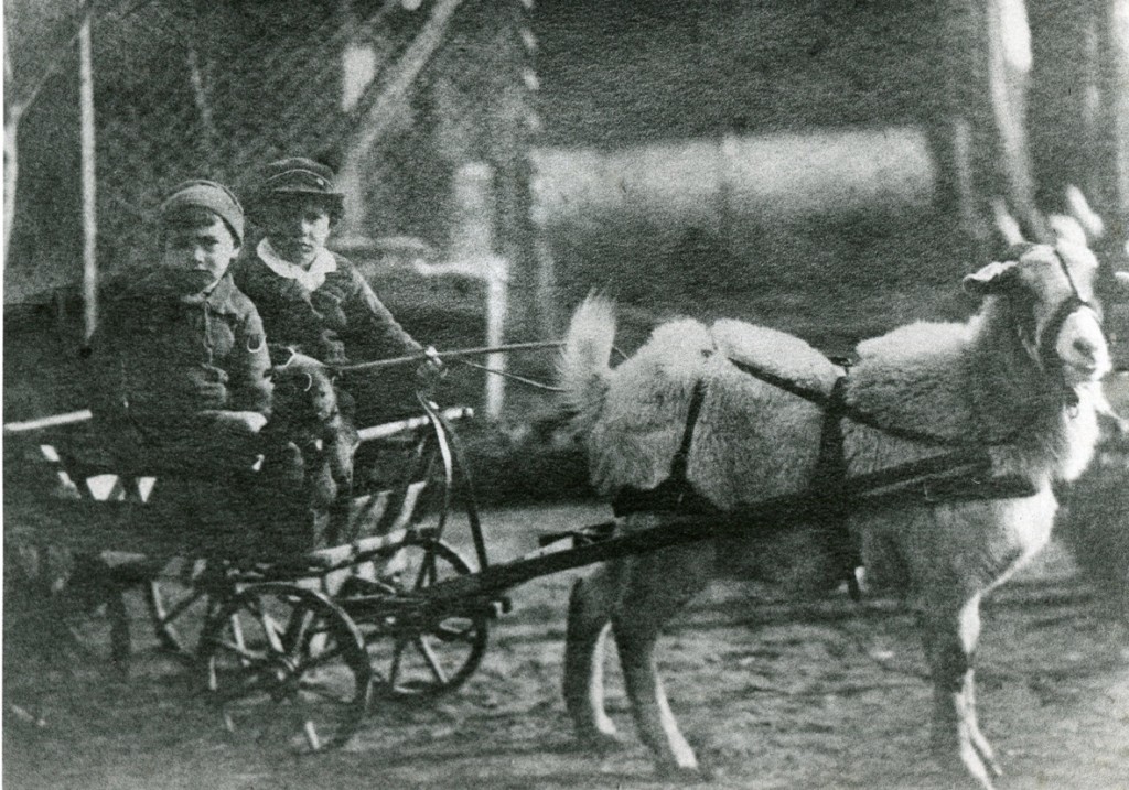 Esta fotografía podría formar parte de un álbum familiar. La imagen muestra a dos niños sobre un carro impulsado por una cabra.