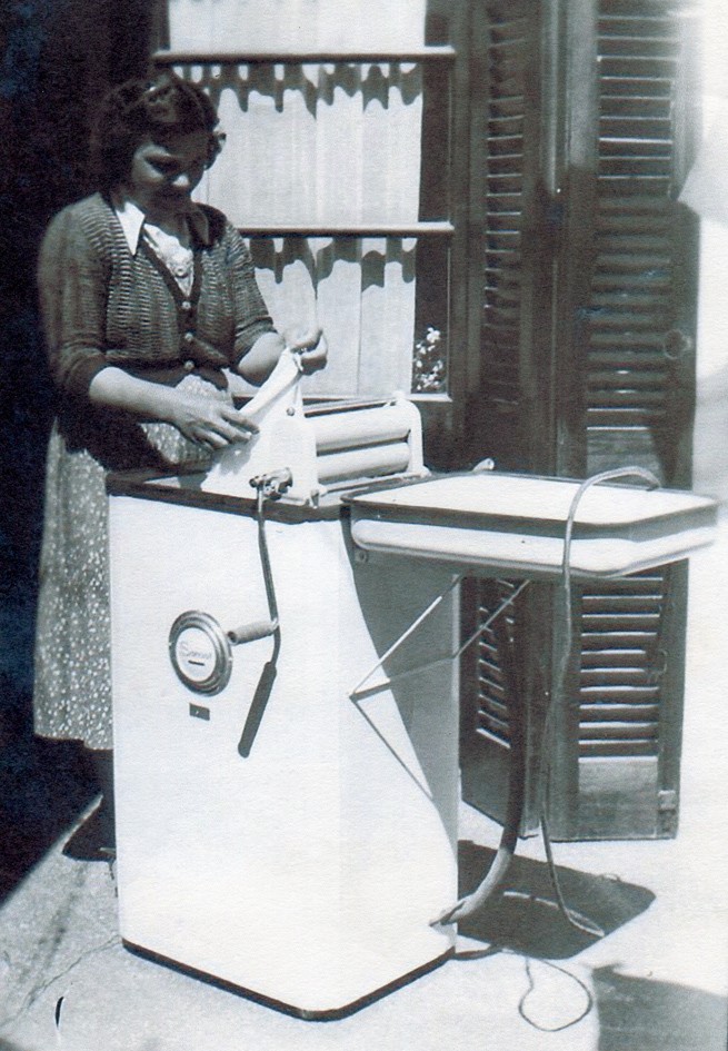 Imagen de una vecina de Vicente López junto a un lavarropas de la época.