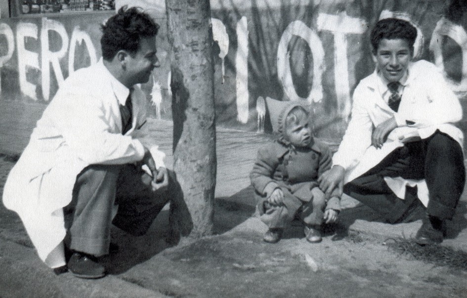 Fotografía de Julio Calcaterra, peluquero y fotógrafo de Carlos Gardel y Quintana en Olivos, acompañado de su empleado e hijo Horacio.