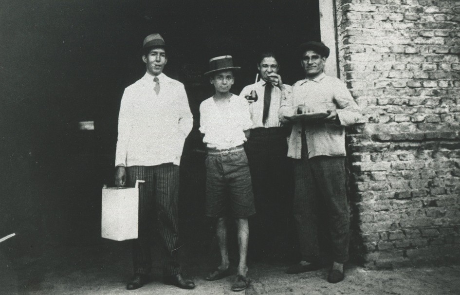 Un grupo de vecinos en la entrada de la forrajería de Félix García. Don Félix había nacido en Santochello, Salamanca-España, y vino a la Argentina hacia 1911.