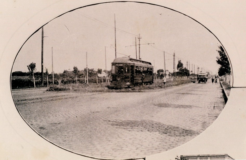 La imagen muestra un tranvía circulando por la avenida Maipú, a la altura de la calle Malaver.