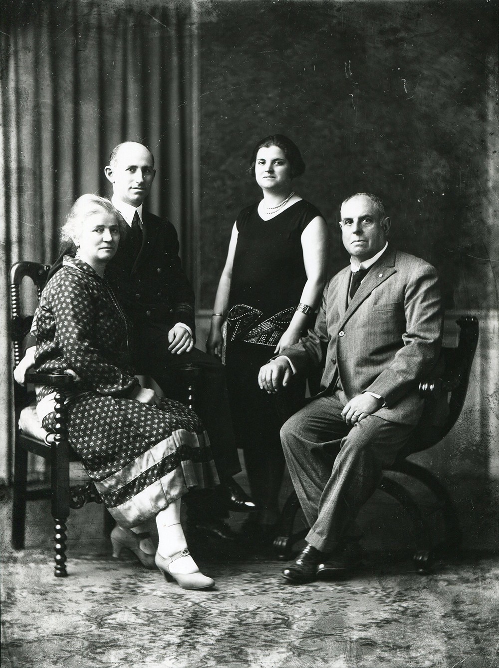 Desde la izquierda, la imagen muestra a Rosa Gay de Ferrer, Vicente, Susana y Vicente Ferrer padre. Vicente Ferrer fue uno de los primeros habitantes de Florida, donde construyó su residencia, Villa Rosa, en homenaje a su esposa. Pionero del barrio, contribuyó a la instalación del primer tendido eléctrico y telegráfico, así como al empedrado, la posta policial y la sala de primeros auxilios. Su hija, Susana Ferrer, se convirtió en la primera fotógrafa registrada de Vicente López, continuando la tradición familiar en el ámbito de la fotografía.