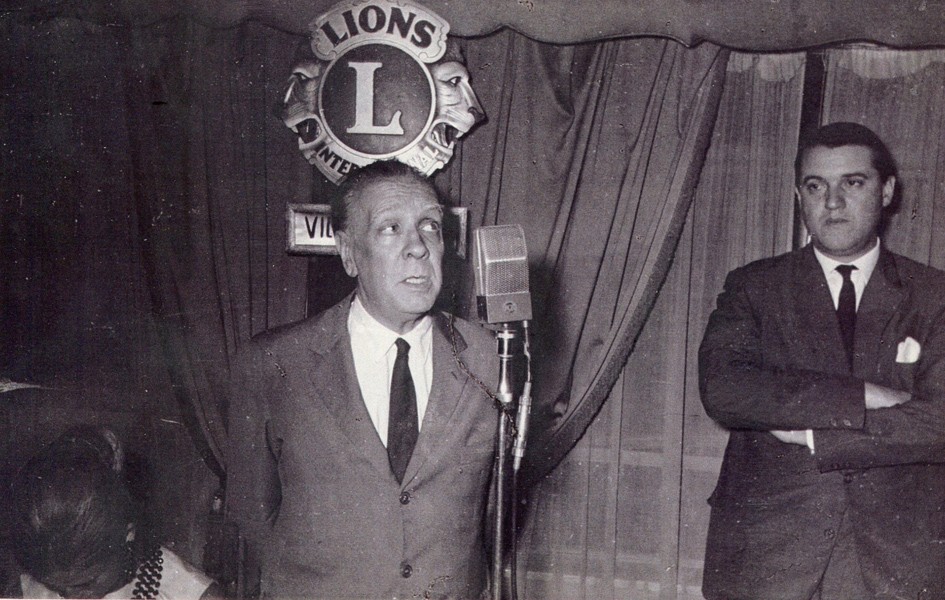 La imagen captura un encuentro especial del Club de Leones de Villa Martelli con Jorge Luis Borges como invitado.