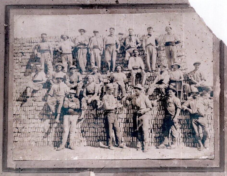 La imagen muestra a obreros posando sobre una pila de ladrillos, en un horno de ladrillos de Munro.
