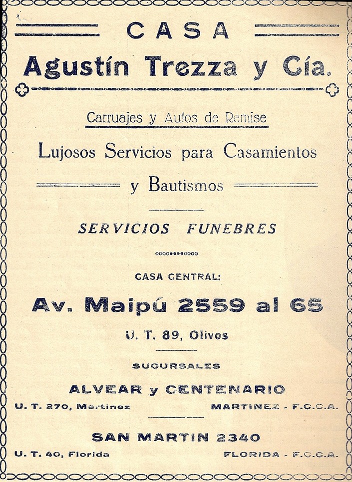 Aviso publicitario de la casa de servicios fúnebres, carruajes y autos remise Agustín Trezza y Cía., publicado en el Anuario La Democracia, órgano de la juventud radical de Vicente López.