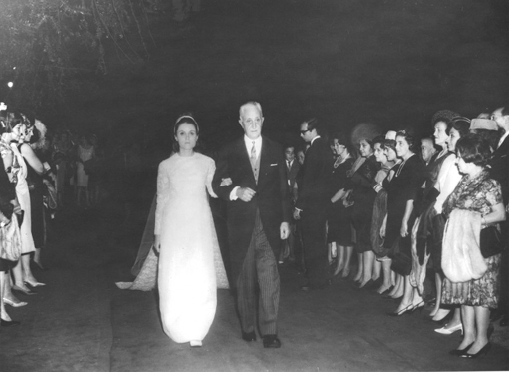 El presidente Arturo U. Illia acompaña a su hija Emma Silvia al altar, instalado en los jardines de la Quinta Presidencial de Olivos, donde contraerá matrimonio con Gustavo T. Soler.