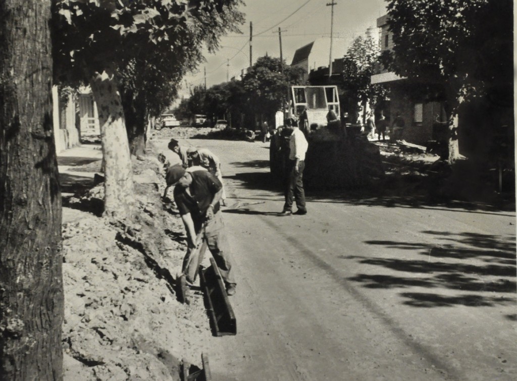 Fotografía del trabajo de bacheo y pavimentación en la intersección de la Avenida Maipú y la calle Lavalle, donde se observan operarios realizando mejoras en el estado del pavimento.