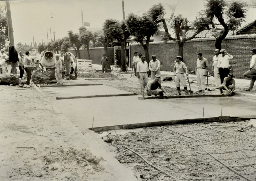 Hombres trabajando en la pavimentación de la calle Mariano Pelliza, entre Bernardo O'Higgins y Blas Parera, colectora de la Autopista Panamericana Pascual Palazzo, a cargo del Departamento de Mantenimiento municipal.