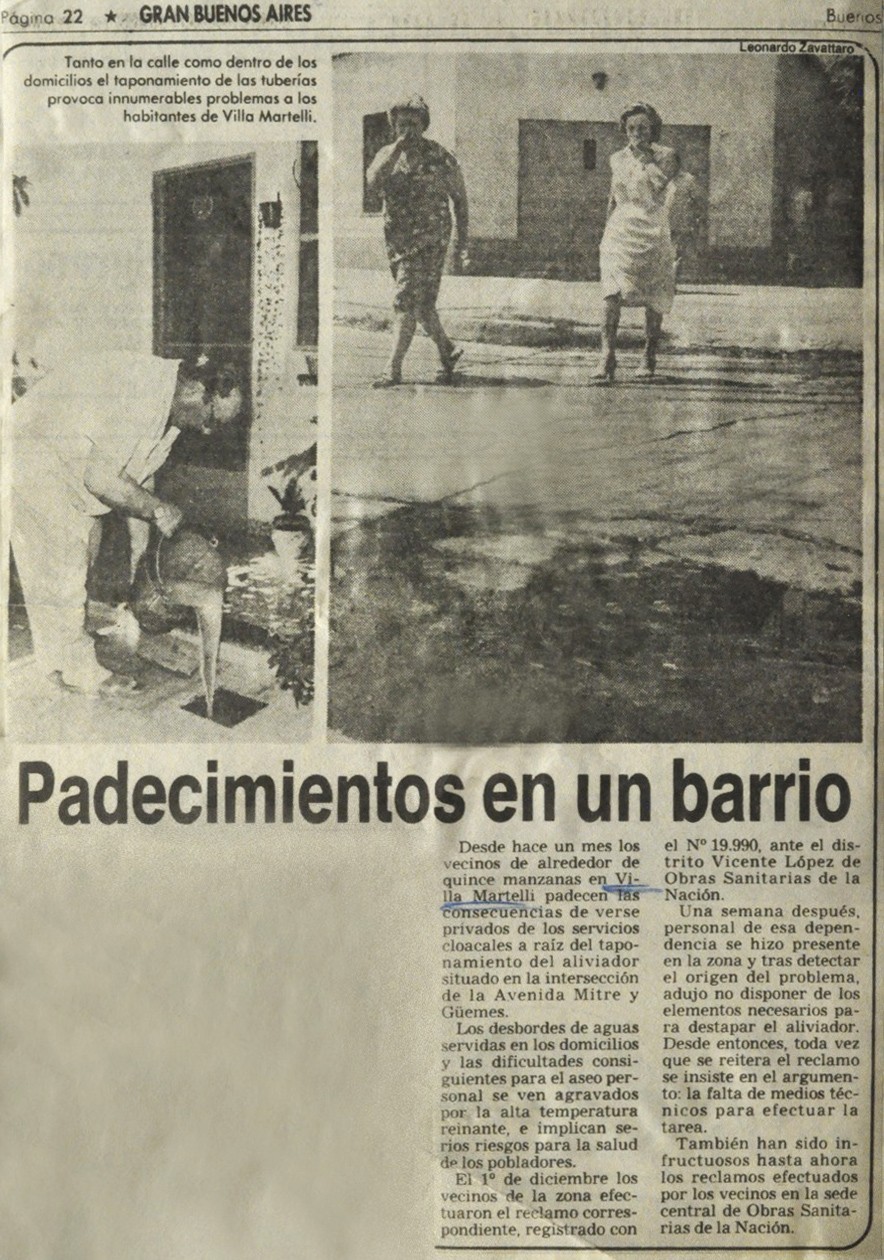 Nota periodística del diario Clarín que menciona los problemas en los servicios cloacales en el barrio de Villa Martelli. Desde hace un mes, vecinos de alrededor de quince manzanas sufren la falta del servicio debido al taponamiento del aliviador en la intersección de la Avenida Mitre y Güemes.