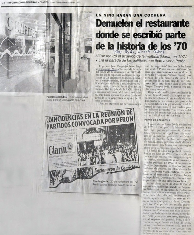 En una nota publicada por el diario Clarín el 20 de noviembre de 1995, se informó sobre la demolición del restaurante Nino, ubicado en Avenida del Libertador y Urquiza, Vicente López, para dar lugar a una cochera. Este lugar fue un punto de encuentro clave en la política de los años '70, especialmente en 1972, cuando allí se realizó el histórico acuerdo de la multipartidaria.