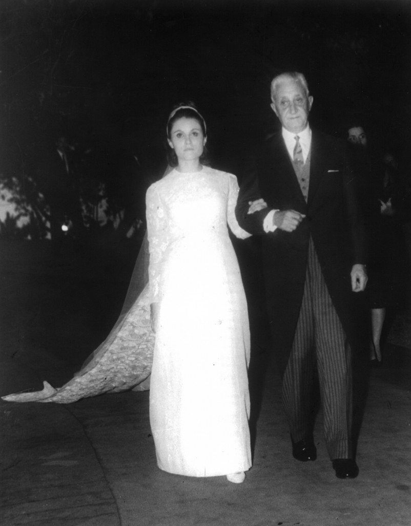 El presidente Arturo U. Illia y su esposa Silvia Martorell durante la ceremonia religiosa, donde actuaron como padrinos en la boda de su hija Emma Silvia con el doctor Gustavo T. Soler, en el altar dispuesto en los jardines de la Quinta de Olivos.