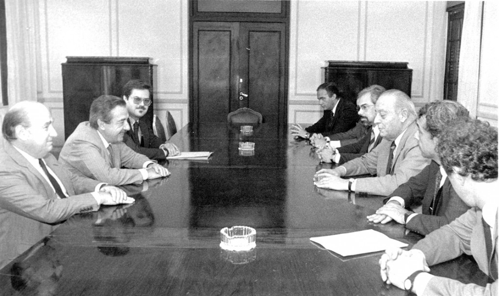 El presidente de la nación, Raúl Alfonsín, reunido en la Quinta Presidencial con el ministro de Trabajo y Seguridad Social Ideler Tonelli.