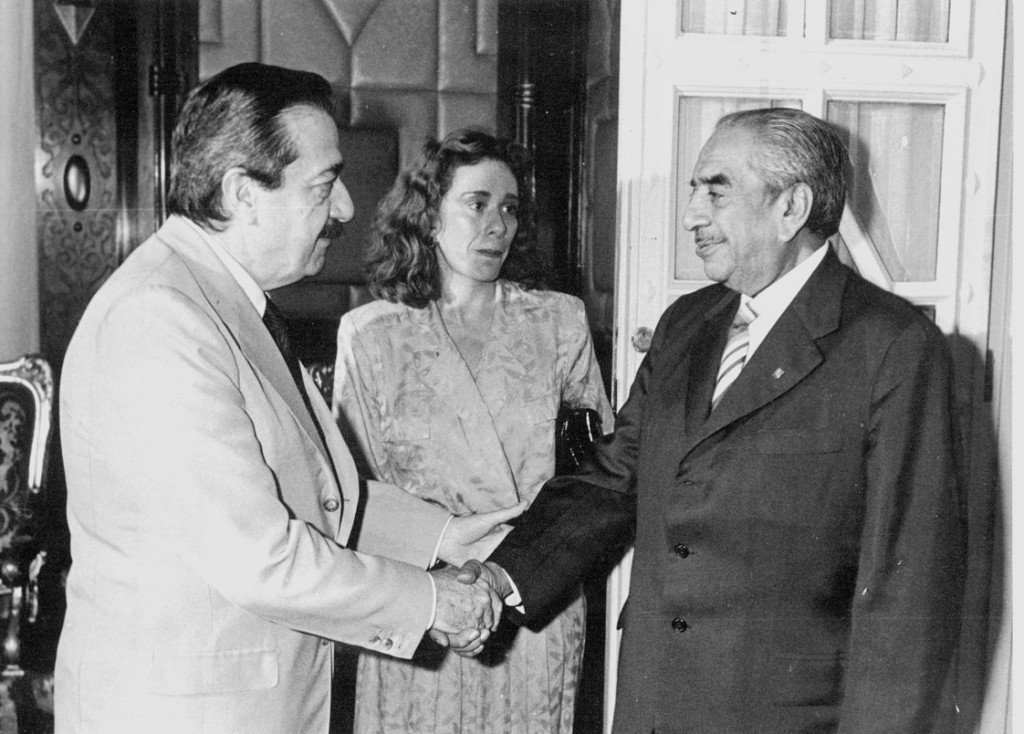 El presidente de la Nación Raúl Alfonsín recibe en su despacho en la Quinta Presidencial de Olivos a la diputada María Cristina Guzmán y su padre Horacio Guzmán.