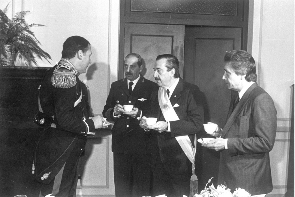 El presidente de la Nación comparte el tradicional chocolate con el jefe del Regimiento de Granaderos a Caballo, coronel Hugo Fernández; el jefe de la Casa Militar, brigadier Héctor Panzardi, y el intendente de Vicente López, Jorge Sabattini.