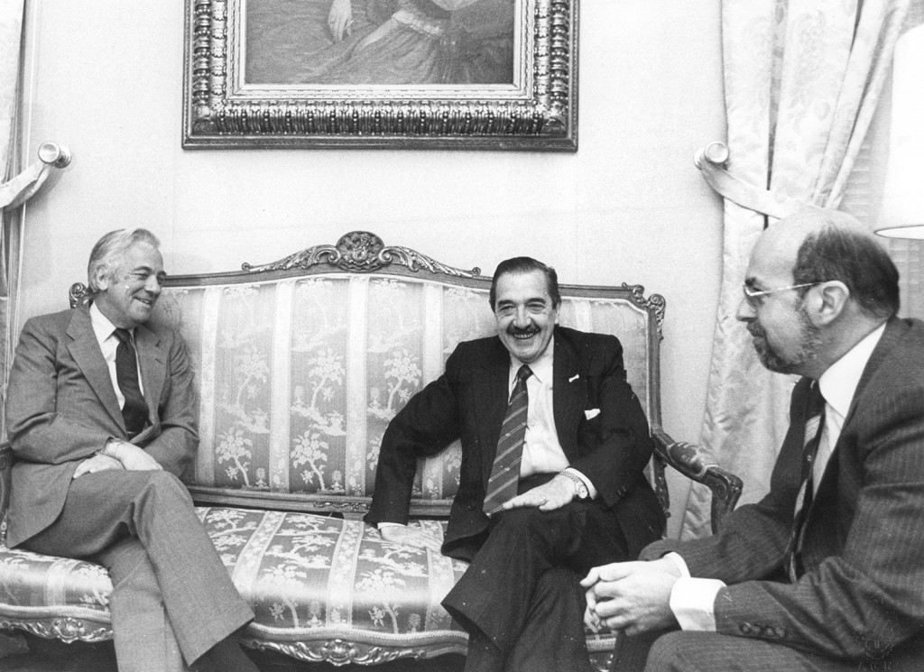 El presidente de la Nación Raúl Alfonsín (mandato 10/12/1983 - 8/7/1989) reunido en la Quinta Presidencial de Olivos con el Secretario de Estado Adjunto de los Estados Unidos, John Whitehead.