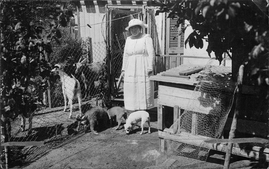 Julieta Lanteri en su residencia de Olivos alimentando a sus animales. Esta fotografía fue sacada para la revista "Caras y Caretas".