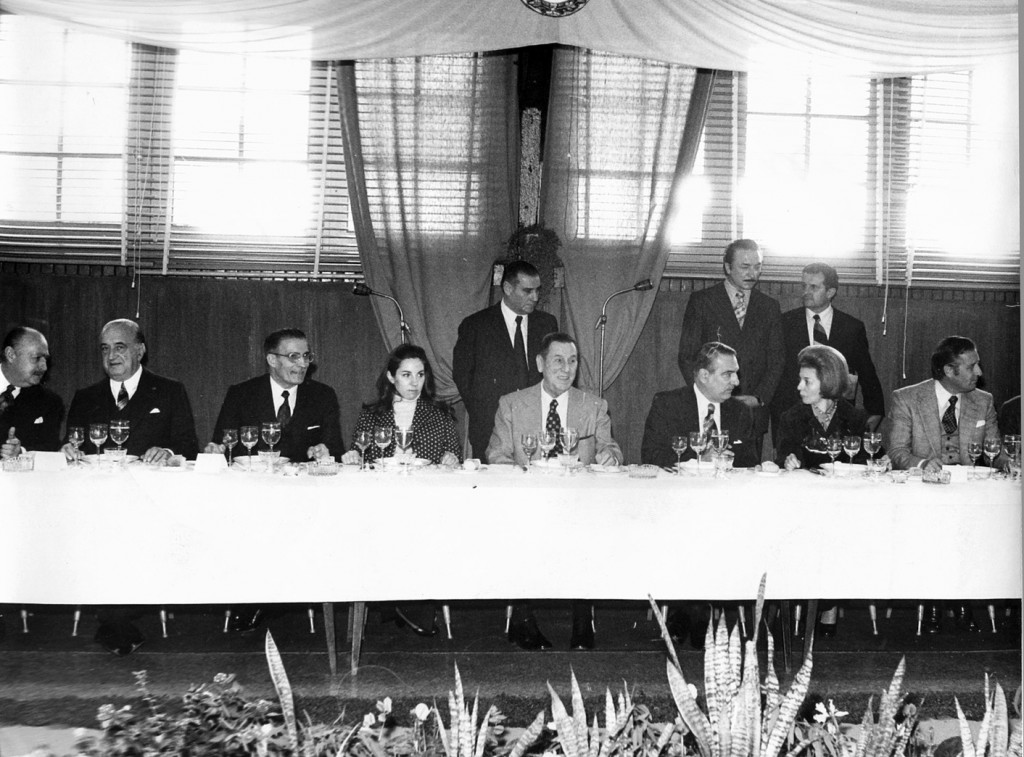 El presidente Juan Domingo Perón en la Residencia Presidencial de Olivos junto a su esposa, Isabel Martínez, reciben a gobernadores.