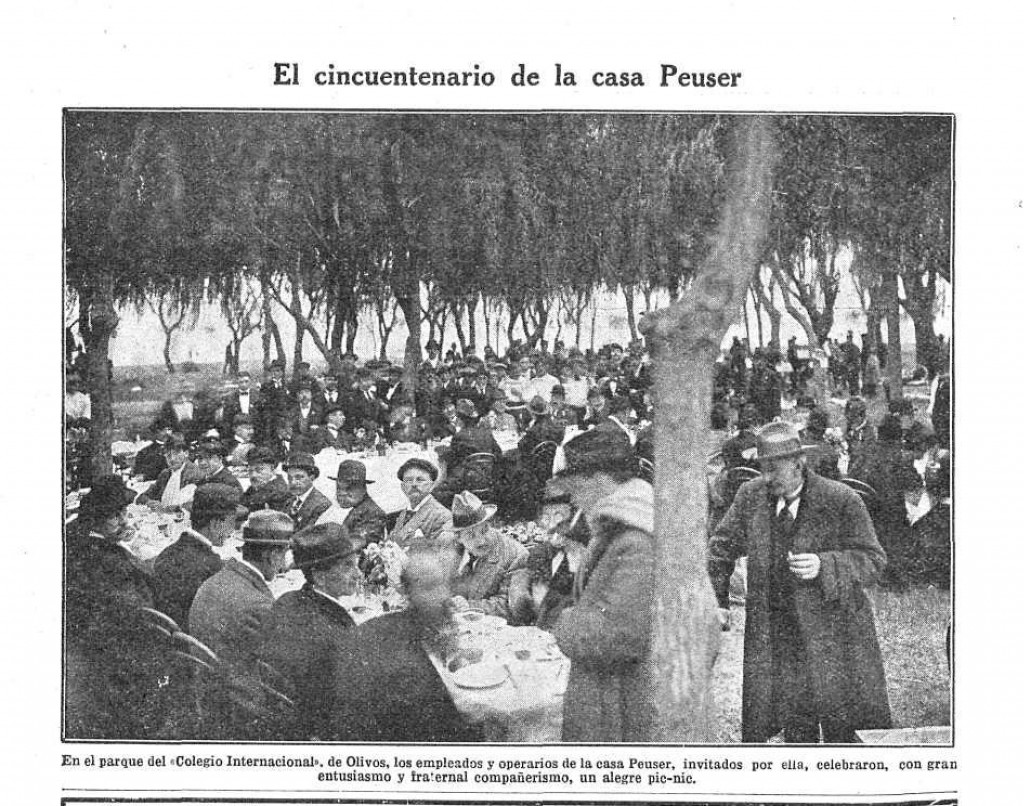 Fotografía en la revista Caras y Caretas que retrata un encuentro al aire libre organizado en el parque del Colegio Internacional de Olivos, donde los empleados y operarios de la casa Peuser, invitados por la empresa, participaron con entusiasmo y camaradería.