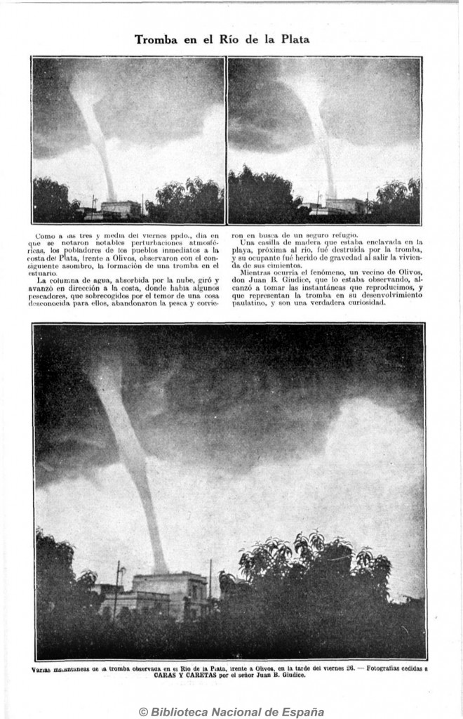 Fotografías proporcionadas a la revista Caras y Caretas por Juan B. Giudice, vecino de Olivos, documentan la tromba en el Río de la Plata.