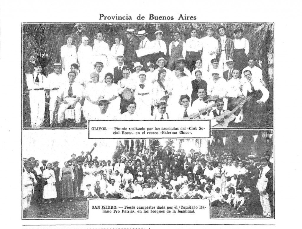 Fotografía en la revista Caras y Caretas, publicada el 3 de abril de 1918, sobre el encuentro al aire libre realizado por los asociados del Club Social Roca en el recreo Palermo Chico, en Olivos.