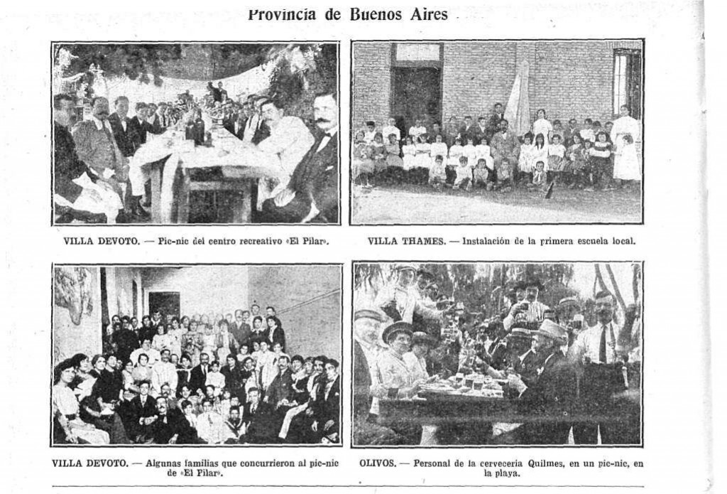 Fotografía en la revista Caras y Caretas, publicada el 11 de abril de 1914, sobre el personal de la cervecería Quilmes en un encuentro al aire libre en la playa de Olivos.