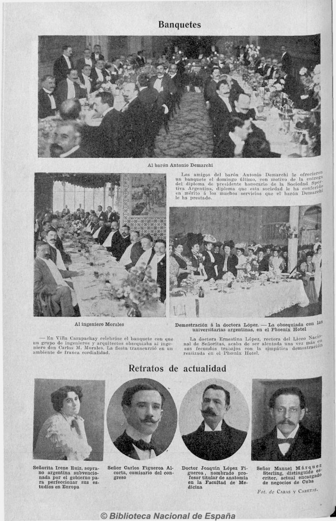 Fotografía en la revista Caras y Caretas publicada el 18 de mayo de 1907, sobre el banquete celebrado en Villa Carapachay, en honor al ingeniero Carlos M. Morales, ofrecido por un grupo de ingenieros y arquitectos, en un ambiente de cordialidad.