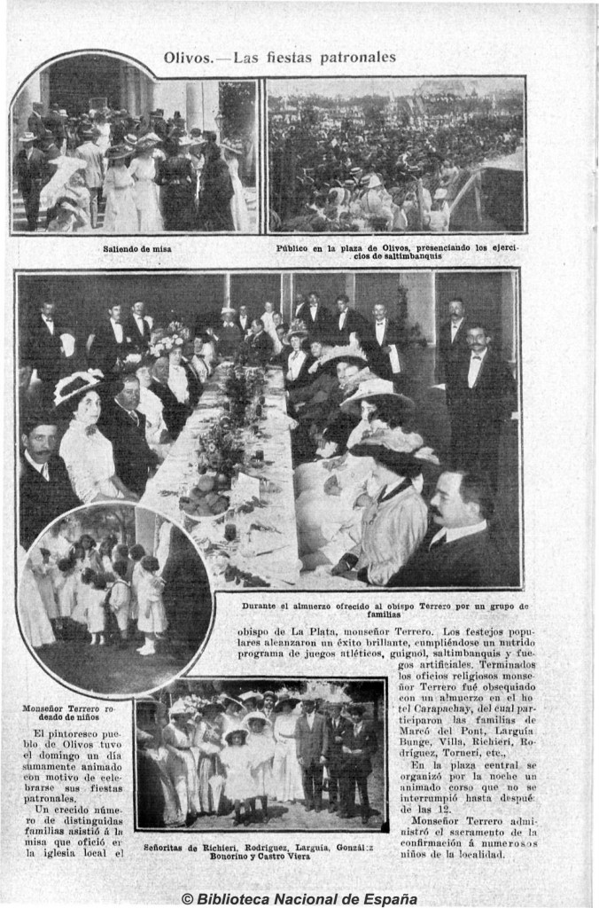 El 20 de febrero de 1909, la revista Caras y Caretas publicó una serie de fotografías bajo el título "Olivos.- Las fiestas patronales". El pintoresco pueblo de Olivos celebró un día muy animado con motivo de sus fiestas patronales, a las que asistieron distinguidas familias. Monseñor Terrero, obispo de La Plata, ofició la misa y luego fue homenajeado con un almuerzo en el Hotel Carapachay, junto a varias familias notables. Los festejos incluyeron juegos, saltimbanquis, y un corso que se extendió hasta después de la medianoche. Además, monseñor Terrero administró el sacramento de la confirmación a varios niños.
