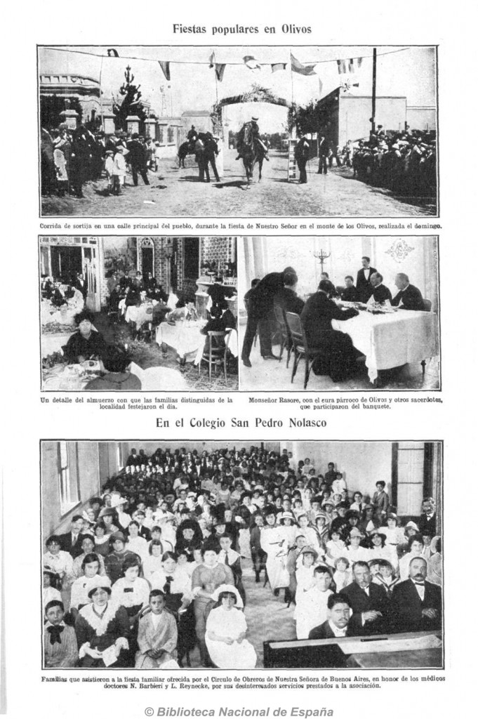 Fotografías en la revista Caras y Caretas, publicada el 21 de febrero de 1914, bajo el título "Fiestas populares en Olivos". Una imagen muestra la corrida de sortija en una de las calles principales del pueblo, durante la fiesta de Nuestro Señor en el monte de los Olivos. Otra captura un detalle del almuerzo que las familias distinguidas de la localidad ofrecieron para festejar el día.