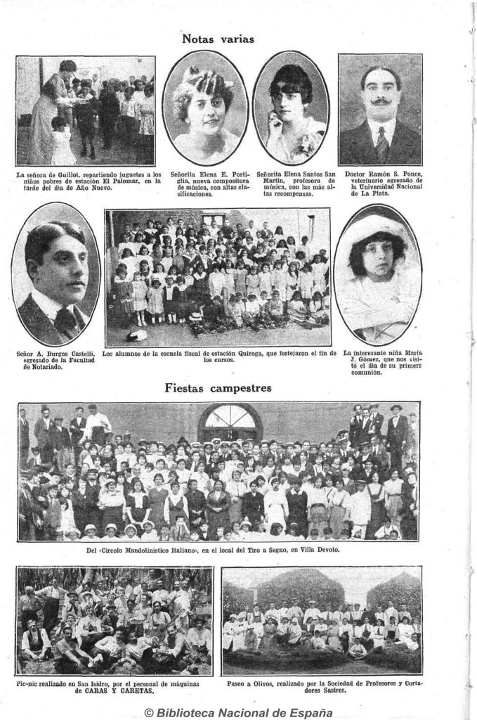 Fotografía publicada en la revista Caras y Caretas el 23 de enero de 1915. La imagen muestra un paseo a Olivos, realizado por la Sociedad de Profesores y Cortadores Sastres.