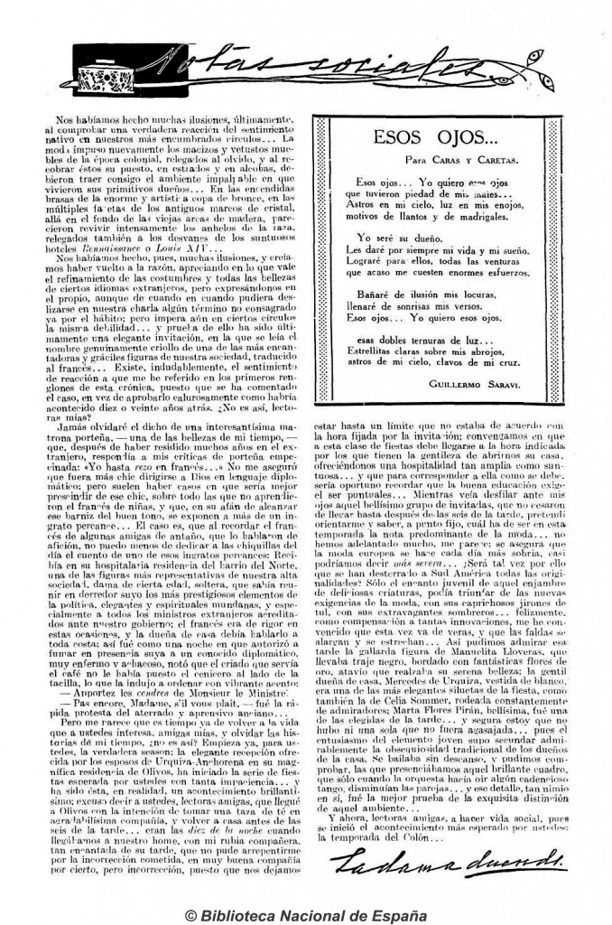 En la nota de La dama duende para la revista Caras y Caretas, se describe detalladamente la fiesta que tuvo lugar en la residencia del matrimonio Urquiza-Anchorena, ubicada en la localidad de Olivos.