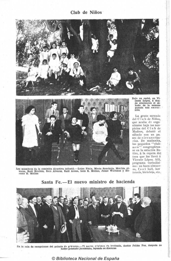 Fotografías publicadas en la revista Caras y Caretas el 28 de enero de 1911, bajo el título Club de niños. Las imágenes muestran una excursión realizada bajo un ombú en Vicente López. Entre los participantes se encuentran los miembros de la comisión directiva infantil: Luisa Fitón, Mario Sanahuja, Matilde Álvarez, Raúl Birabén, Sara Álvarez, Raúl Arana, Luis R. Molina, Jaime Wartman y Horacio R. Molina.