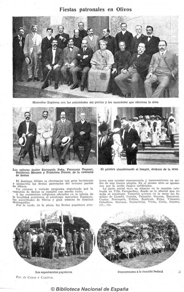 Fotografías publicadas en la revista Caras y Caretas el 29 de febrero de 1908, bajo el título Fiestas Patronales en Olivos. Las imágenes muestran a monseñor Espinoza junto a las autoridades del pueblo y los sacerdotes que oficiaron la misa, a los miembros de la comisión de fiestas, y al público saliendo del templo tras la ceremonia religiosa.