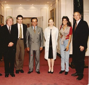 El presidente de la Nación, Carlos S. Menem, se encuentra acompañado, de izquierda a derecha, por Alan Parker, Antonio Banderas, Madonna, Zulema Menem y Jonathan Pryce en la quinta de Olivos el 24 de febrero de 1996.