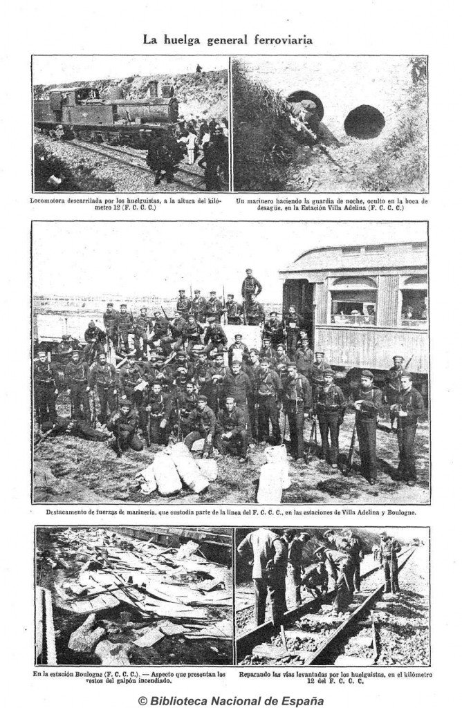 Fotografías publicadas en la revista Caras y Caretas el 29 de septiembre de 1917, en el contexto de la huelga general ferroviaria. Las imágenes documentan incidentes en la línea del Ferrocarril Central de Córdoba (F.C.C.C.), donde una locomotora fue descarrilada y tramos de las vías fueron levantados en el kilómetro 12.